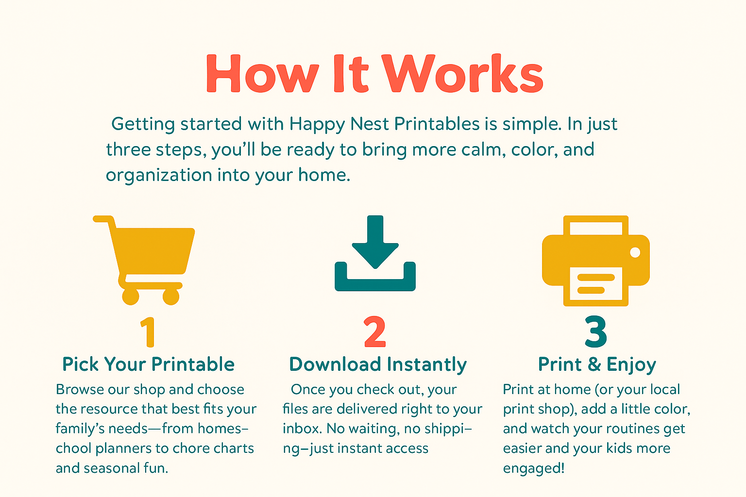 At Happy Nest Printables, we’re parents too — which means we understand the chaos, the mess, and the magic. Everything we create is built to save you time, ease your stress, and bring more calm to your nest. We’re here to help you focus on what matters most: making happy memories with your kids.